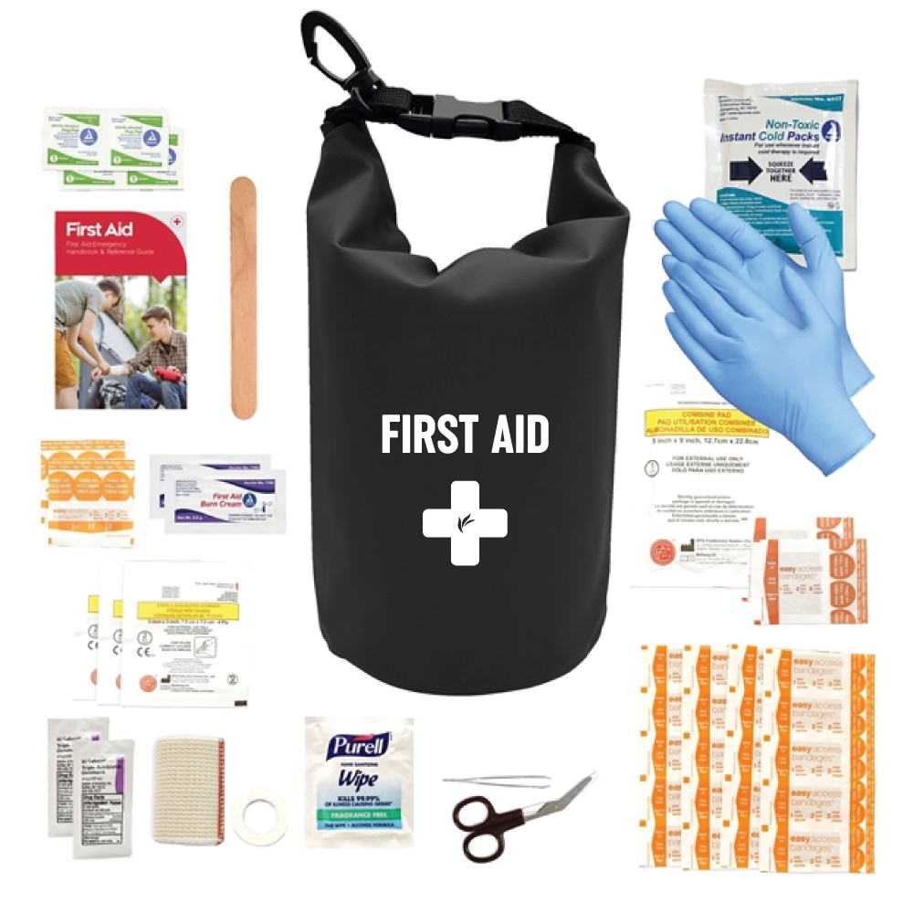 sku: BIQ384Deluxe Poly Module, you get the following: 1 trauma pad 5 x 9, three 3 x 3 sterile gauze pads pkg/2, one instant cold pack 5 x 6, one pair of scissors, 15 fabric bandages 1" x 3", 2 finger tip bandages, 2 extra-large bandages elbow/knee, 1 pair of nitrile gloves, 1 cloth tape 1/2" x 5 yards, and 1 finger splint. In our Essentials 2 Module, you get: 4 alcohol wipes, 2 triple antibiotic ointment, 1 first aid mini quick facts card, 5 fabric bandages 1" x 3", one pair of metal tweezers, 2 burn cream packets, one 48-page first aid guide, 1 elastic bandage with hook and loop fastener, and 2 wet ones antibacterial wipes. What a fantastic way to spread the word about your brand!