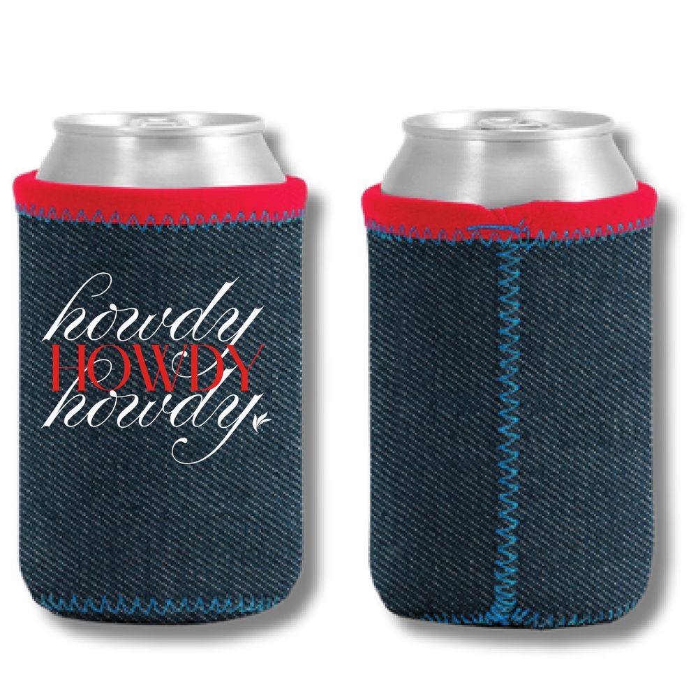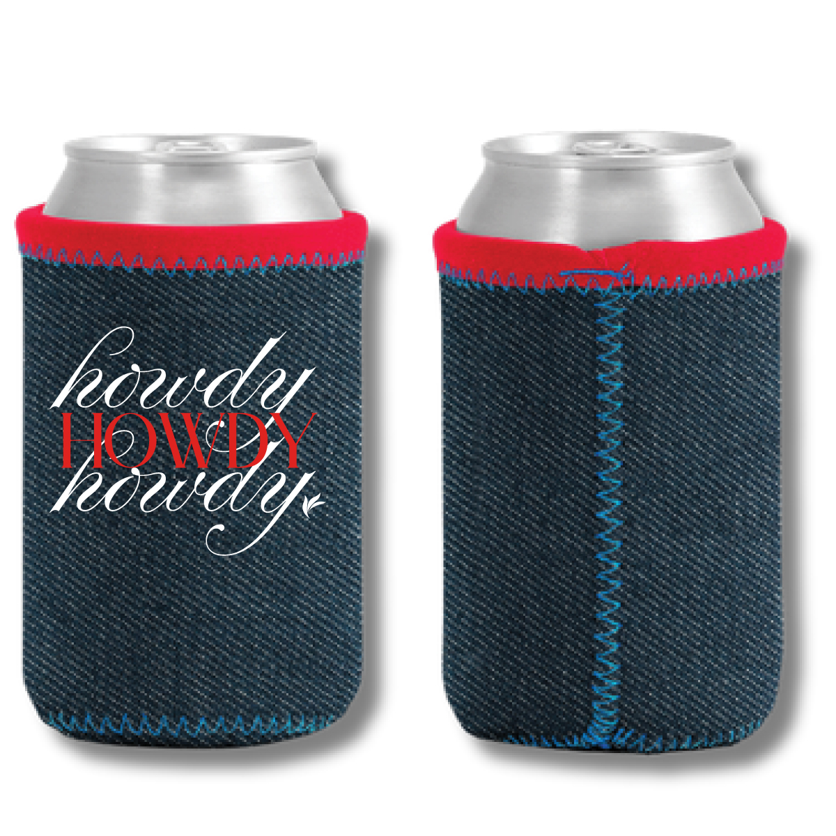 Denim/High-Quality Neoprene ( Wetsuit Material ), collapsible insulator with sewn-in bottom and customizable colored stitching and bias trim at top.